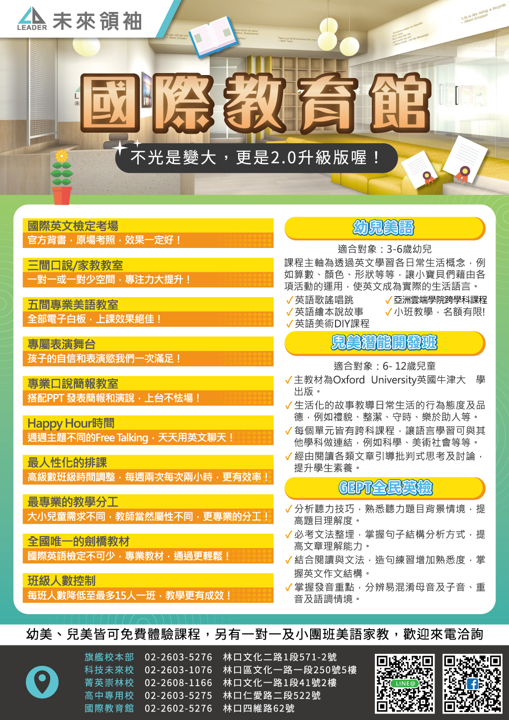 國中教育會考 0 天 高中學測 0 天 高中指考 0 天 E化教學領航者 / Leader of E-teaching 亞洲雲端學院 AI雲端世代最專業測驗分析平台 亞洲教學+ 數位互動教學共享平台 亞洲大管家 一站式教務行政管控系統 亞洲智慧學習歷程 108課綱最完整的學習歷程輔導 國小六年級資優數學 國小夏令營 閱讀素養寫作課程 國小寒令營 六升七暑期素養營隊 六升七暑期全科先修 升小一先修班 正音美語 國三A++魔考班 國際美語館 隆重開幕 分校資訊 Branches 未來旗艦校本部 電話 : 02-2603 5276 地址 : 林口區文化二路1段571-2號 前往地圖 未來科技校區 電話 : 02-2603 1076 地址 : 林口區文化一路一段250號5樓 前往地圖 菁英崇林校區 電話 : 02-2608 1166 地址 : 林口區文化一路1段41號2樓 前往地圖 高中專用校區 電話 : 02-2603 5275 地址 : 林口區仁愛路二段522號 前往地圖 國際教育館 電話 : 02-2602 5276 地址 : 林口區四維路62號 前往地圖 未來旗艦校本部 未來科技校區 菁英崇林校區 高中專用校區 國際教育館