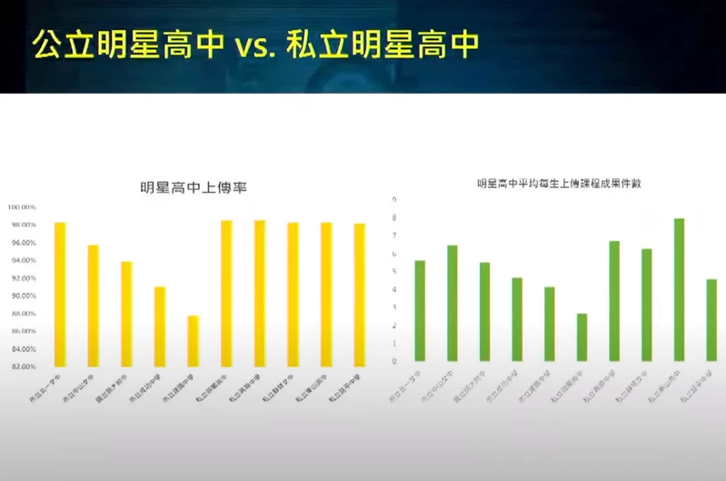 國教署統計各校學生上傳學習成果情形,明星私校如薇閣、再興、東山、延平等校上傳率都達九成八,高於建中的八成八。私校生平均上傳件數也在七到九件之間,高於公校的四到六件。